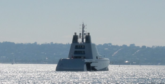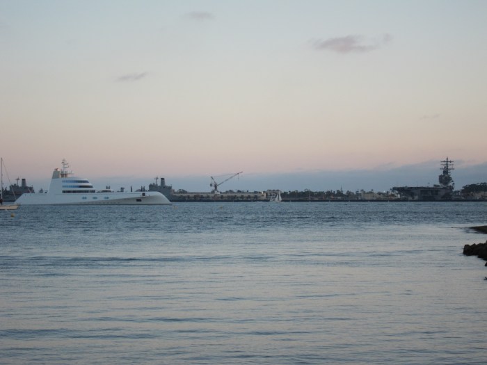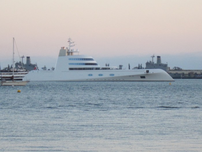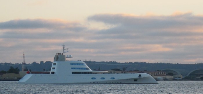 These are pictures that I took of the spectacular and futuristic Superyacht A in San Diego Bay yesterday (08-11-2010). I found out that it is owned by 39 year old Russian billionaire Andrey Meinchenko and that it cost $300,000,000.00. The German built ship has a crew of 42, can cruise at 23 knots and has a range of 6,000 miles. It also has a helipad forward of the superstructure and is equipped with small speed boats that can be deployed from the aft section of the vessel. It looks like it belongs in a James Bond movie. Very cool.