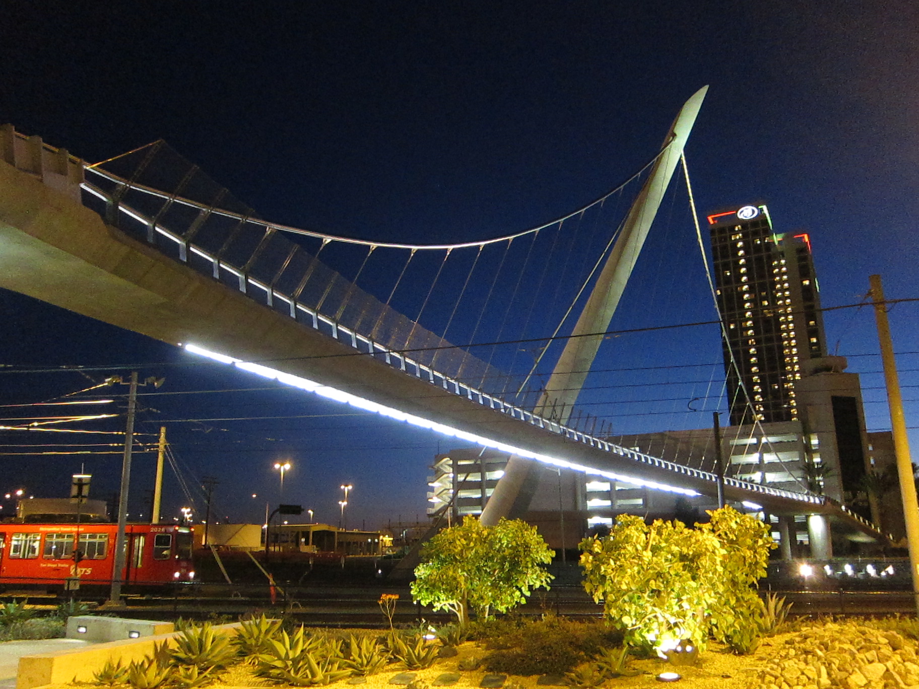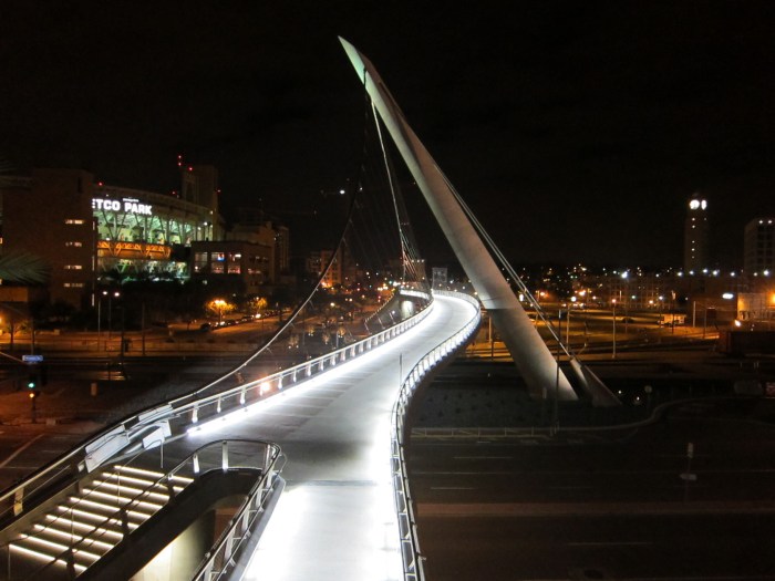 The Harbor Drive Pedestrian Bridge (HDPB) at night. This impressive bridge opened to the public on March 18th, after nearly three years of construction. The span connects San Diego’s downtown Ball Park/East Village section to the waterfront.