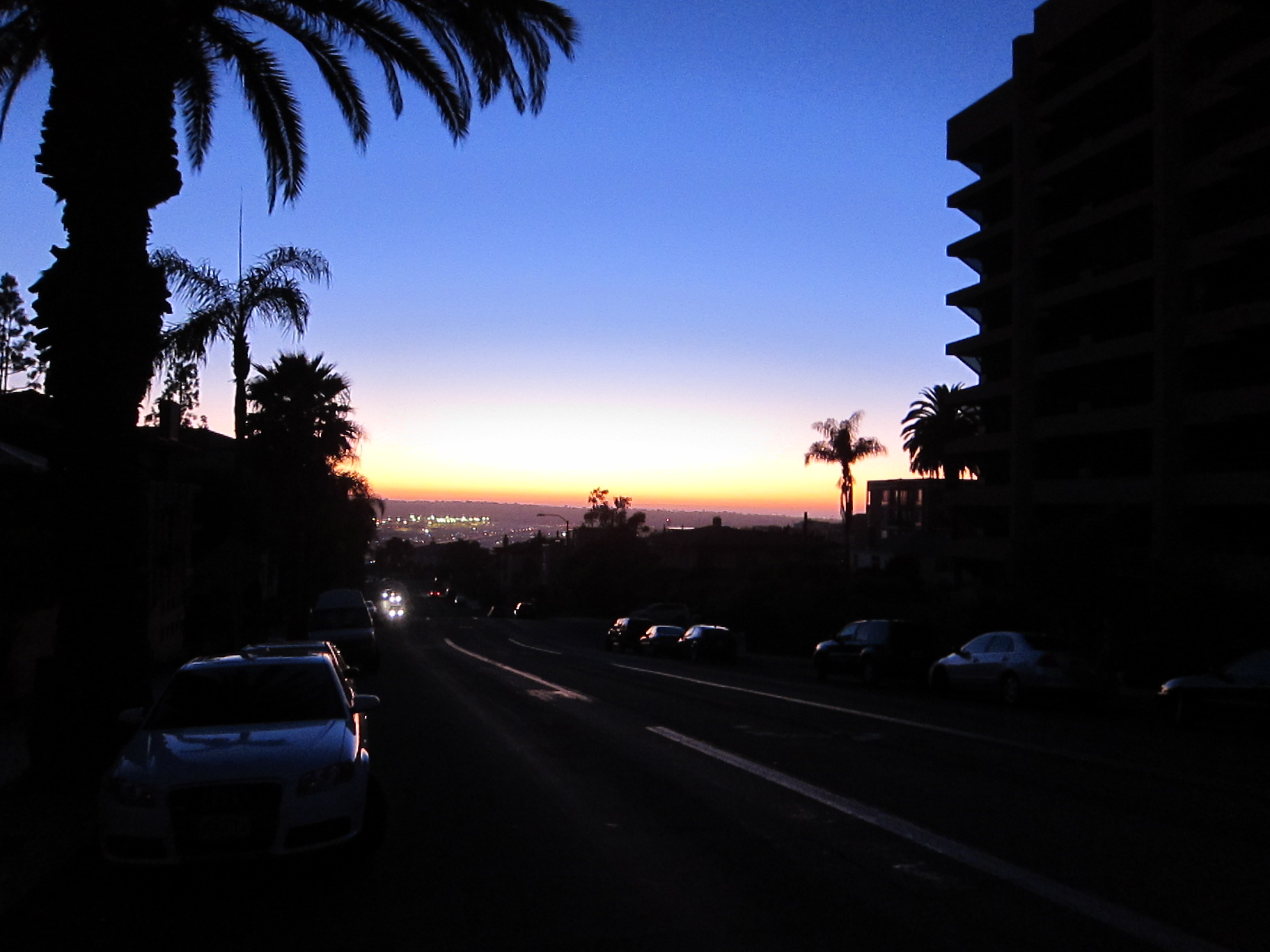September 8th, 2011. This blackout caused the lights to go out in a large part of Southern California, as well as parts of western Arizona and northwest Mexico. Fortunately, the blackout only lasted about 12 hours, but it did bring normal life in the area to a screeching halt. I took this picture at the upper end of Laurel Avenue, on Bankers Hill, facing west and looking down on San Diego’s main airport, Lindbergh Field. The airport had emergency power available for the runway, but not the passenger terminals, so flights came to stop as well.